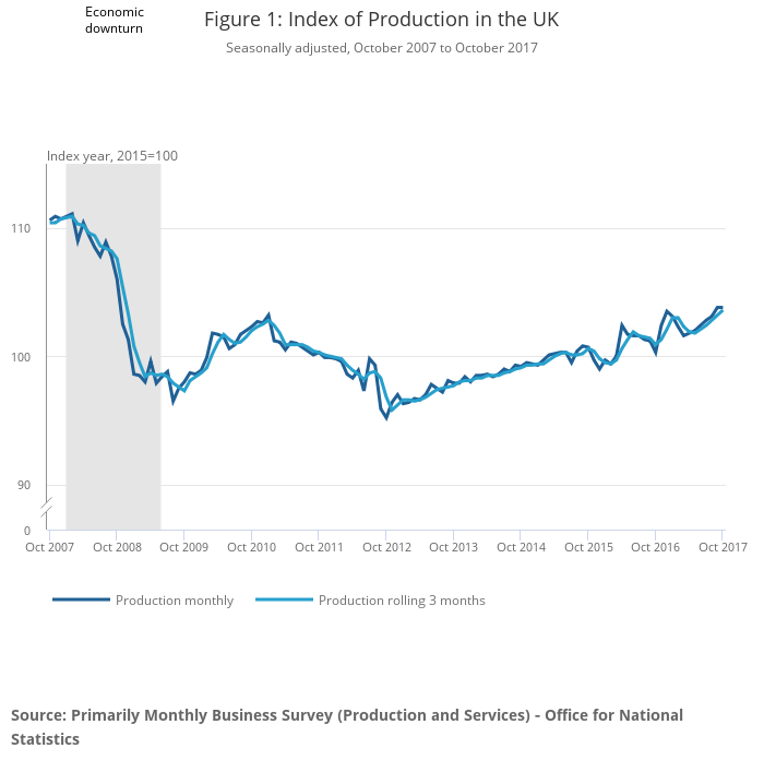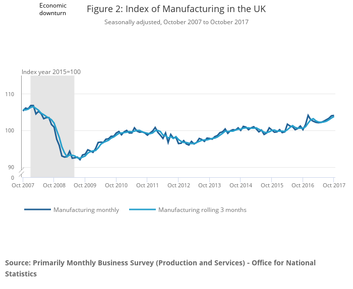 Figures 1 and 2 show that both the Index of Production (IoP) and Index of Manufacturing (IoM) followed a broadly upward trend following the economic downturn. Growth was more pronounced from the beginning of 2010, as the economy recovered, before a downturn during 2012. Since then, both production and manufacturing output have risen but remain below their level reached in the pre-downturn gross domestic product (GDP) peak in Quarter 1 (Jan to Mar) 2008, by 6.1% and 2.1% respectively in the three months to October 2017.