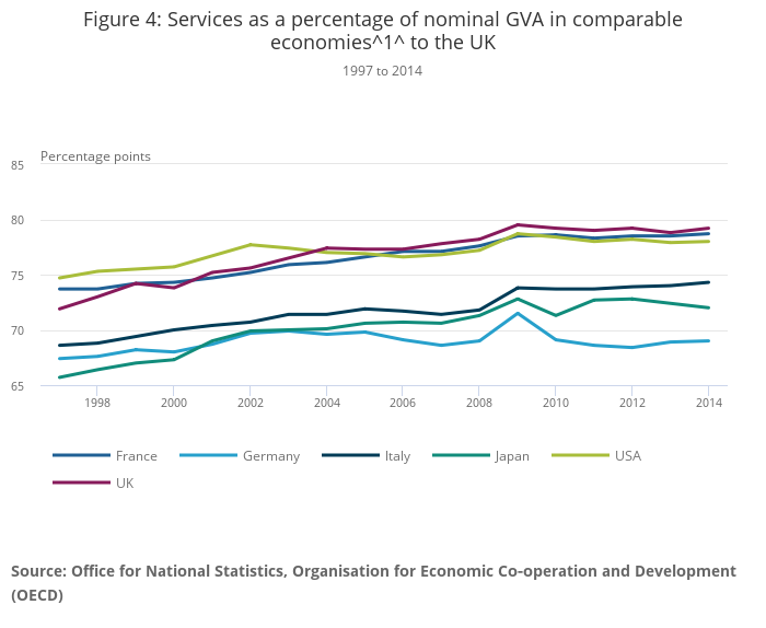 Image .csv .xlsFigure 4 shows the share of nominal (unadjusted for the effect of price changes) gross value added (GVA) accounted for by services in the UK and a selection of other major economies. More information on data for France, Germany, Italy, Japan and the USA can be found on the Organisation for Economic Co-operation and Development (OECD) website. In 1997, the share of nominal GVA accounted for by services in the UK was just under 72%, in the top half of the range relative to the other economies shown. By 2014 the UK had become relatively more reliant on services, as its share rose to over 79% of nominal GVA.
