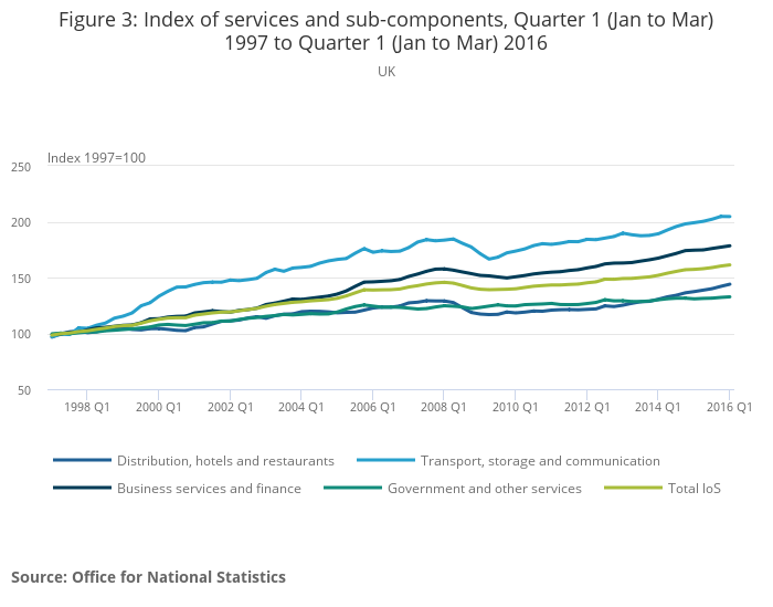 The Index of Services increased by 0.6% in Quarter 1 (Jan to Mar) 2016 compared with Quarter 4 (Oct to Dec) 2015. This figure was unrevised from the estimate used in the gross domestic product (GDP) second estimate, published on 26 May 2016. This figure is consistent with the Quarterly National Accounts, published on 30 June 2016.