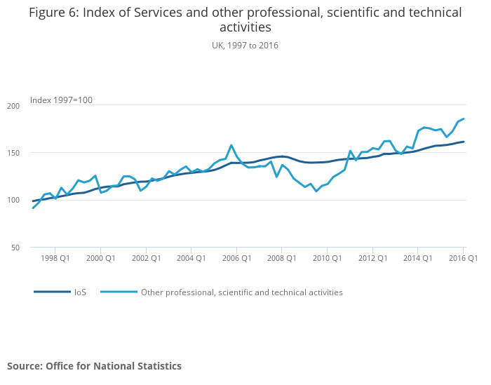 Services then returned to strong and consistent growth, growing at a compound average growth rate of 0.6% per quarter and surpassing its pre-downturn peak in Quarter 2 (Apr to June) 2012. Despite contracting more than services as a whole in the downturn, other professional, scientific and technical activities saw much faster growth, growing at a compound average growth rate of 2.1% per quarter. By Quarter 1 (Jan to Mar) 2016 the services industries as a whole were 10.7% above their value in Quarter 1 (Jan to Mar) 2008, while other professional, scientific and technical activities was 35.8% above its value.