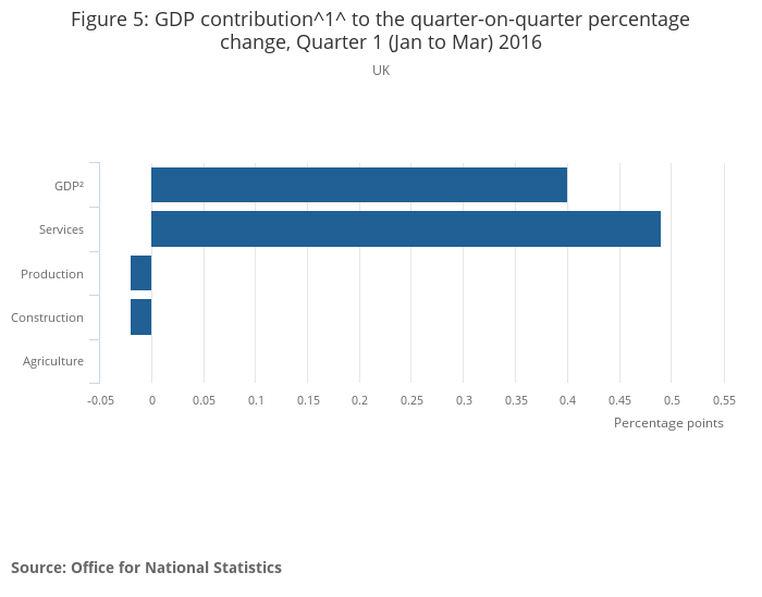 In Quarter 1 (Jan to Mar) 2016, GDP was estimated to have increased by 0.4% compared with the previous quarter. The contribution an industry grouping makes to the GDP quarterly growth is dependent on the quarterly change in that industry grouping and its weight within the output approach to measuring GDP.
