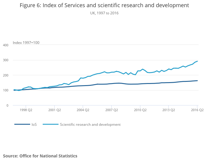 Since 1997, the services industries as a whole have grown at a faster rate than all other headline industries. While gross domestic product (GDP) has grown at a compound average growth rate (further information on compound average growth can be found in background note 11) of 2.0% per year from 1998 to 2015, services have grown at a compound average growth rate of 2.6% per year. (More information can be found in (Gross Domestic Product Preliminary Estimate: Quarter 3 (July to Sept) 2016). This has led to a continuing re-orientation of the economy towards services, despite productivity in the services industries as a whole rising more slowly than in the production industries (and manufacturing in particular) since 1997 (more information can be found in Labour Productivity: Apr to June 2016). The higher output growth therefore reflects the increasing share of the labour force employed in services, which grew from 73% to 80% between 1997 and 2015 (UK Labour Market: October 2016).