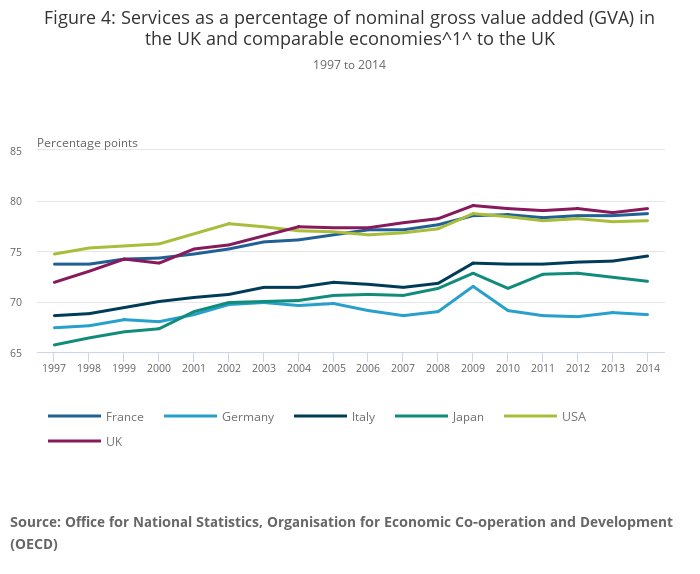 Image .csv .xlsFigure 4 shows the share of nominal (unadjusted for the effect of price changes) gross value added (GVA) accounted for by services in the UK and a selection of other major economies. More information on data for France, Germany, Italy, Japan and the USA can be found on the Organisation for Economic Co-operation and Development (OECD) website. In 1997, the share of nominal GVA accounted for by services in the UK was just under 72%, in the top half of the range relative to the other economies shown. By 2014 the UK had become relatively more reliant on services, as its share rose to over 79% of nominal GVA.