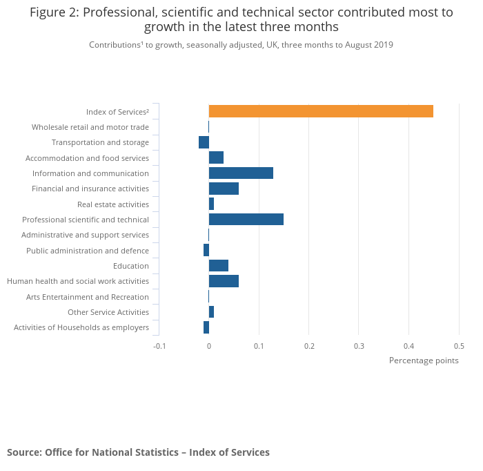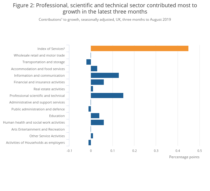 Offsetting some of this was professional, scientific and technical activities. The sector increased by 0.8% and contributed 0.08 percentage points. Legal activities was behind this rise following a fall in July 2019. The industry increased by 3.1% and contributed 0.05 percentage points.