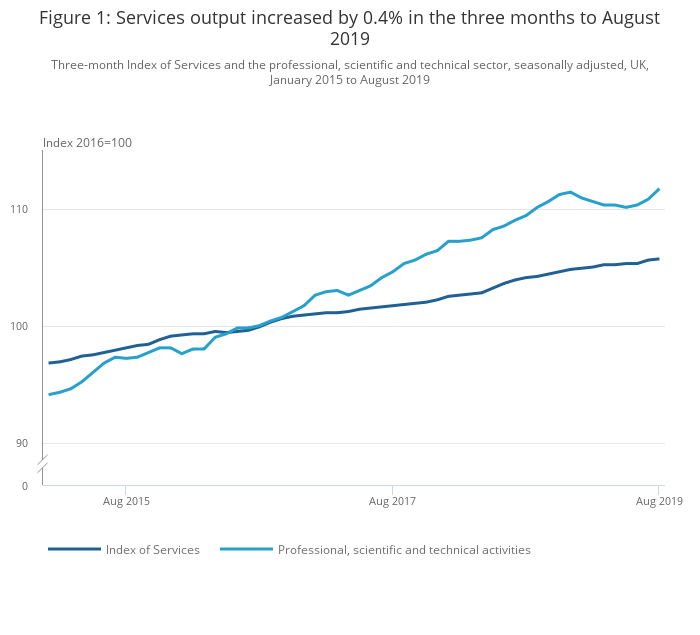 The monthly Index of Services (IoS) provides a timely indicator of growth in the output of the services industries. It is the largest contributor to the output approach in the measurement of gross domestic product (GDP), accounting for 79.6% of UK GDP in 2016. Also published on 10 October 2019 is the GDP monthly estimate, UK: August 2019.