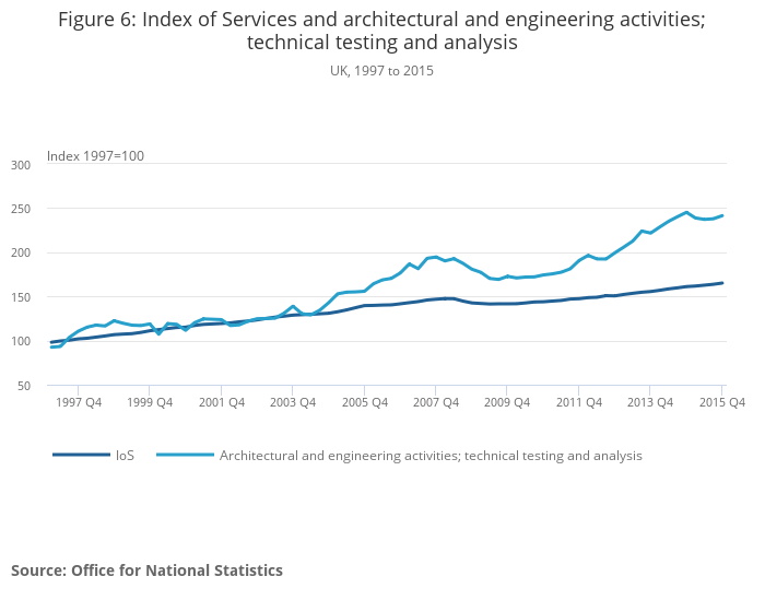 During the economy’s downturn between Quarter 1 (Jan to Mar) 2008 and Quarter 2 (Apr to June) 2009, the output of the services industries contracted by 4.1%. In contrast, architectural and engineering activities; technical testing and analysis reached its pre-downturn peak in Quarter 4 (Oct to Dec) 2007 and its trough in Quarter 3 (July to Sept) 2009, resulting in a reduction in output of 13.0%. Despite the difference in the timing of the peaks and troughs in the industry and services as a whole, both grew strongly following their contractions surpassing their respective pre-downturn peaks in Quarter 1 (Jan to Mar) 2012. By Quarter 4 (Oct to Dec) 2015, the services industries as a whole were 11.9% above their value in Quarter 1 (Jan to Mar) 2008, while architectural and engineering activites; technical testing and analysis was 24.0% above its value in Quarter 4 (Oct to Dec) 2007.