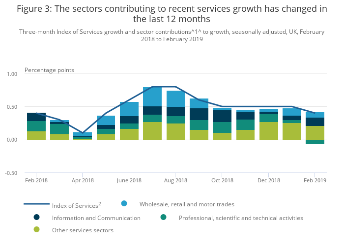 The professional, scientific and technical activities sector has seen consistent strong contributions to positive Index of Services growth since January 2018. However, there has been some weakening more recently and the fall in the three months to February 2018 is the first since April 2017. Several industries within the sector saw strong growth at the end of 2018 and are now seeing a slight fall back at the start of 2019.