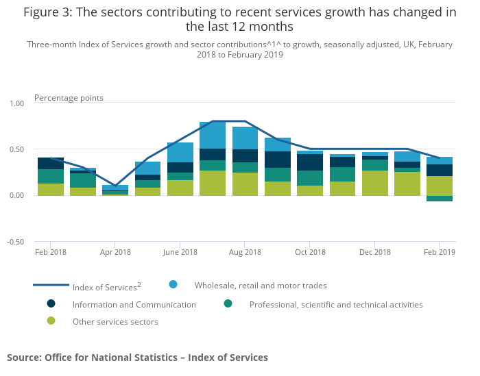 Three-month Index of Services growth and sector contributions1 to growth, seasonally adjusted, UK, February 2018 to February 2019