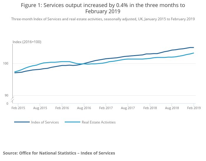 Services output increased by 0.1% in February 2019, following a rise of 0.3% in January 2019.