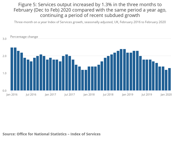 There was a 0.2% growth in services in the three months to February 2020 compared with the previous three months.