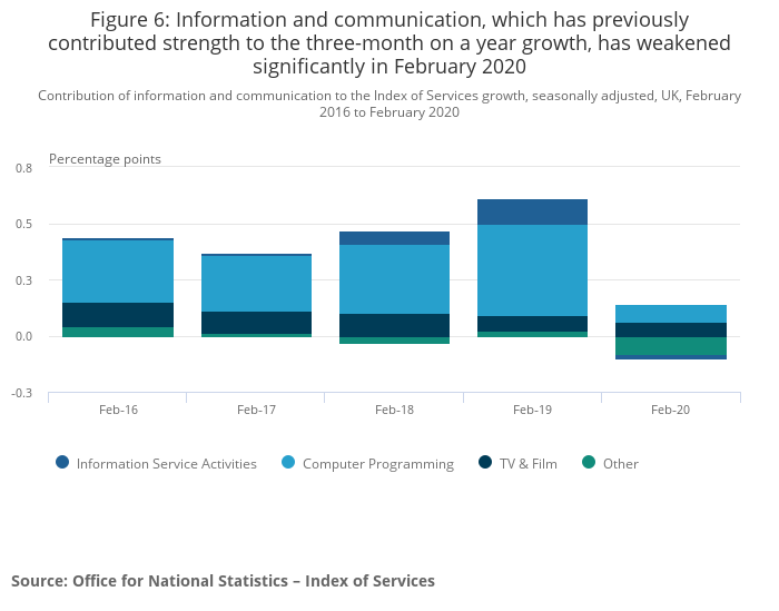 Download this chart Figure 6: Information and communication, which has previously contributed strength to the three-month on a year growth, has weakened significantly in February 2020