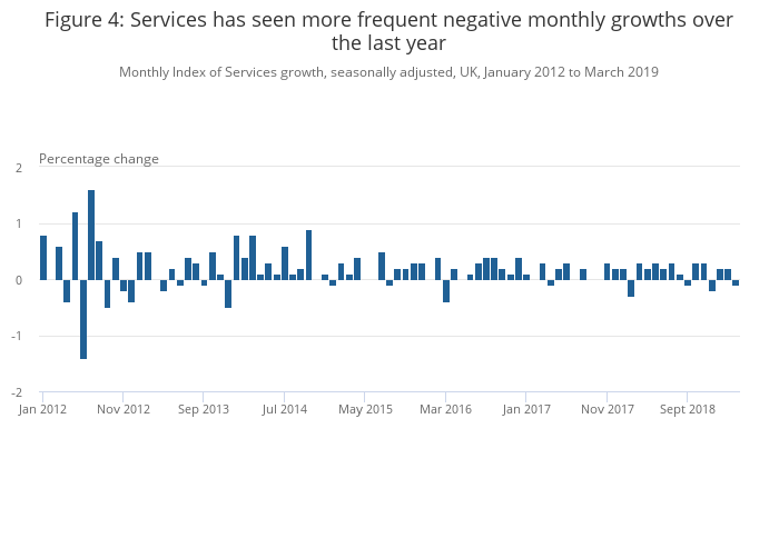 Monthly Index of Services growth, seasonally adjusted, UK, January 2012 to March 2019