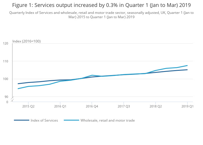 - Services output increased by 0.3% in Quarter 1 (Jan to Mar) 2019 compared with Quarter 4 (Oct to Dec) 2018, following growth of 0.5% for Quarter 4 2018.