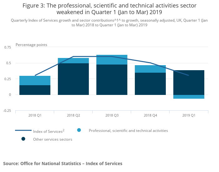 Services growth in Quarter 1 2019 has weakened from Quarter 4 2018. The sector largely responsible for this weakening is the professional, scientific and technical activities sector (Figure 3). After consistent large contributions to services growth throughout 2018 the sector fell in Quarter 1 2019, the first time since Quarter 1 2016.
