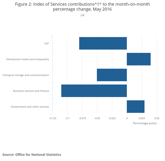 The latest Index of Services estimates show that output decreased by 0.1% between April 2016 and May 2016. This follows positive growth of 0.6% between March 2016 and April 2016, which is unrevised from the previous estimate.