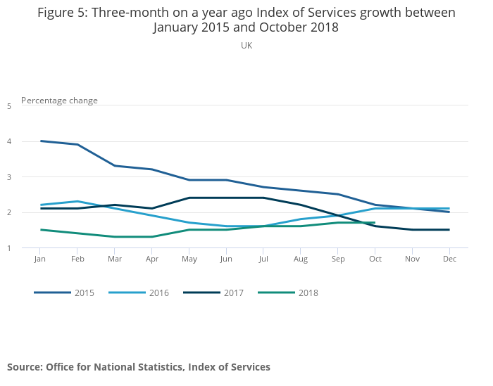 Download this chart Figure 5: Three-month on a year ago Index of Services growth between January 2015 and October 2018