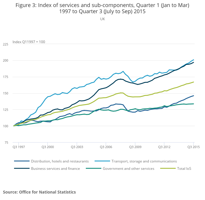 - The Index of Services increased by 0.7% in Quarter 3 (July to Sep) 2015 compared with Quarter 2 (Apr to June) 2015. This figure was unrevised from the estimate used in the Gross Domestic Product (GDP) Preliminary Estimate, published on 27 October 2015. This figure is consistent with the Second Estimate of GDP, published on 27 November 2015.
