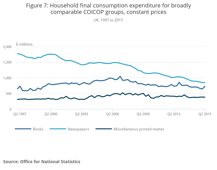 Figure 7 also shows that the spending on newspapers between Quarter 1 (Jan to Mar) 1997 and Quarter 2 (Apr to June) 2015 has more than halved, from around £1.8 billion at the beginning of the period to around £840 million at the end of the period (Consumer Trends, Quarter 2 (Apr to June) 2015). As newspapers are the largest commodity within the 3 classes discussed, this decrease in demand (52.3%) may explain why publishing activities have followed a broadly downward trend over the period.