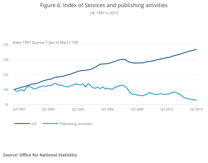 In the period from 1997 to 2015, publishing activities underperformed compared with the services industries as a whole. Between Quarter 1 (Jan to Mar) 1997 and Quarter 1 (Jan to Mar) 2008 this industry followed a broadly upward trend growing at a compound average rate of 0.2% per quarter, while services experienced faster and steadier growth (a compound average rate of 0.9% per quarter) over the same period (further information on compound average growth can be found in background note 11). During the economy’s downturn between Quarter 1 (Jan to Mar) 2008 and Quarter 2 (Apr to June) 2009, the output of the services industries contracted by 4.1%. Publishing activities also contracted during the economy’s downturn with the industry’s output decreasing until Quarter 1 (Jan to Mar) 2010 when it was 16.3% below its Quarter 1 (Jan to Mar) 2008 value.