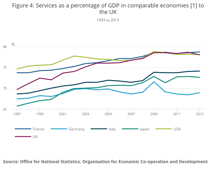 Image .csv .xlsFigure 4 shows the share of gross value added accounted for by services in the UK and a selection of other major economies (more information on data for France, Germany, Italy, Japan and the USA can be found on the Organisation for Economic Co-operation and Development (OECD) website). In 1997, the share of gross value added (GVA) accounted for by services in the UK was just under 70% of nominal GVA, around the middle of the range relative to the other economies shown. By 2013, the UK had become relatively more reliant on services, as its share rose to 78% of nominal GVA.