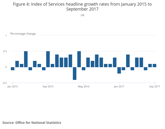 Services output increased by 0.4% in Quarter 3 (July to Sept) 2017 compared with Quarter 2 (Apr to June) 2017; following growth of 0.4% between Quarter 1 (Jan to Mar) 2017 and Quarter 2 2017.