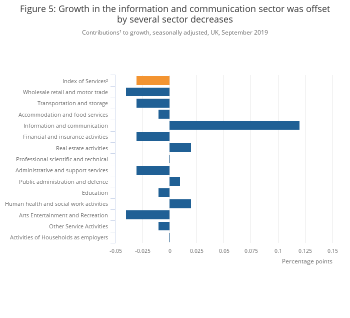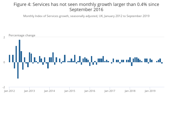 Services output showed no growth to one decimal place in September 2019; this follows a fall of 0.1% in August 2019.