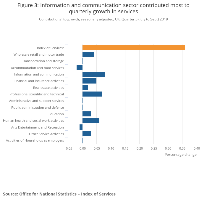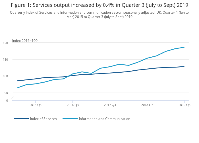 Services output increased by 0.4% in Quarter 3 (July to Sept) 2019 compared with Quarter 2 (Apr to June) 2019.