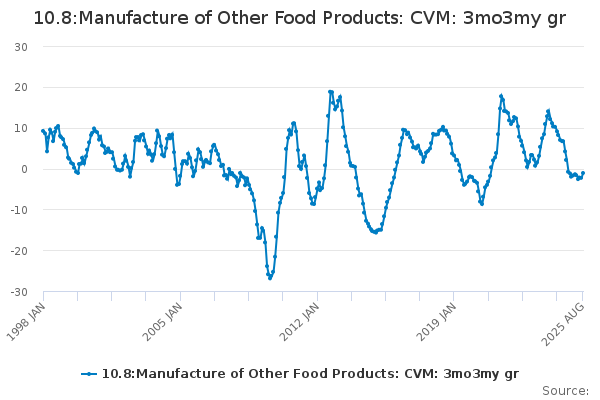 Download this time series10.8:Manufacture of Other Food Products: CVM: 3mo3my gr