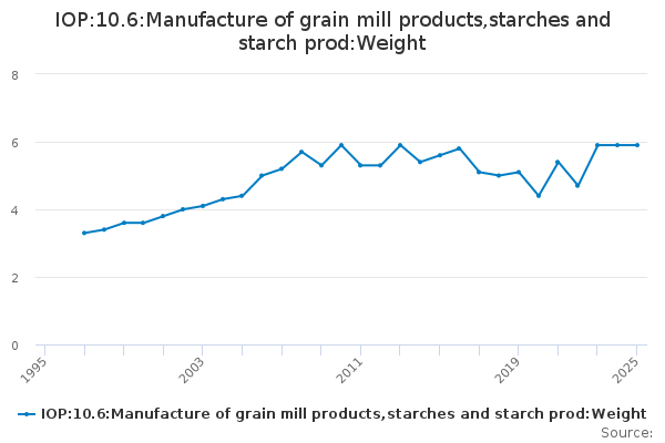 Download this time seriesIOP:10.6:Manufacture of grain mill products,starches and starch prod:Weight