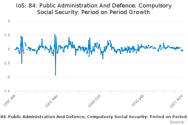 Download this time seriesIoS: 84: Public Administration And Defence; Compulsory Social Security: Period on Period Growth
