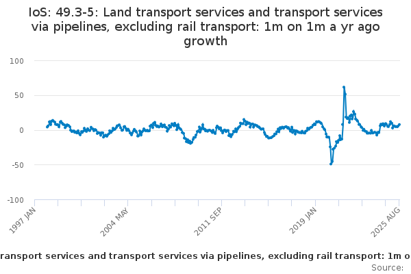 Download this time seriesIoS: 49.3-5: Land transport services and transport services via pipelines, excluding rail transport: 1m on 1m a yr ago growth