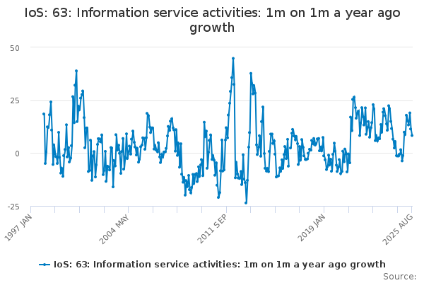 Download this time seriesIoS: 63: Information service activities: 1m on 1m a year ago growth