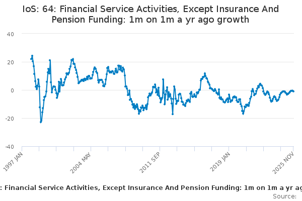 Download this time seriesIoS: 64: Financial Service Activities, Except Insurance And Pension Funding: 1m on 1m a yr ago growth