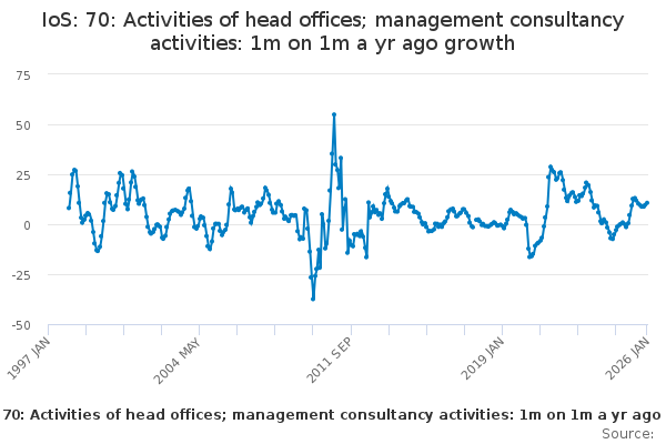 Download this time seriesIoS: 70: Activities of head offices; management consultancy activities: 1m on 1m a yr ago growth