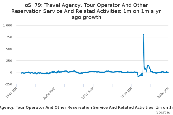 Download this time seriesIoS: 79: Travel Agency, Tour Operator And Other Reservation Service And Related Activities: 1m on 1m a yr ago growth
