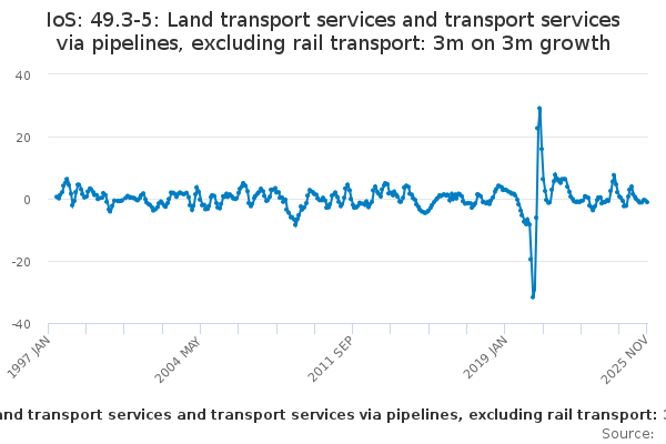 Download this time seriesIoS: 49.3-5: Land transport services and transport services via pipelines, excluding rail transport: 3m on 3m growth