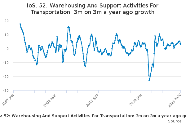 Download this time seriesIoS: 52: Warehousing And Support Activities For Transportation: 3m on 3m a year ago growth