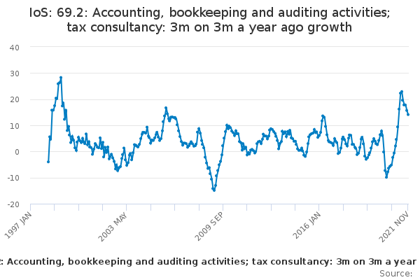 Download this time seriesIoS: 69.2: Accounting, bookkeeping and auditing activities; tax consultancy: 3m on 3m a year ago growth