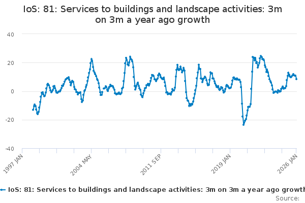 Download this time seriesIoS: 81: Services to buildings and landscape activities: 3m on 3m a year ago growth