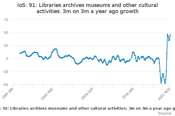 Download this time seriesIoS: 91: Libraries archives museums and other cultural activities: 3m on 3m a year ago growth