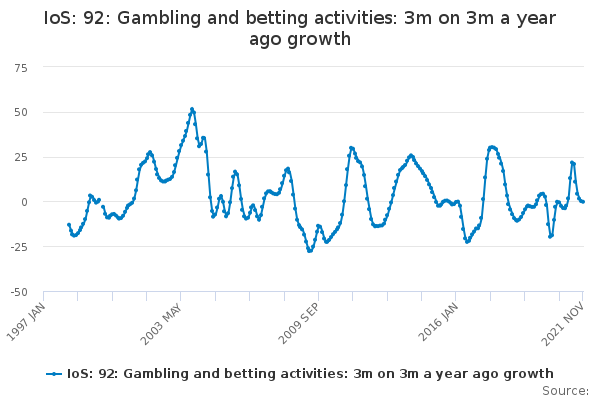 Download this time seriesIoS: 92: Gambling and betting activities: 3m on 3m a year ago growth