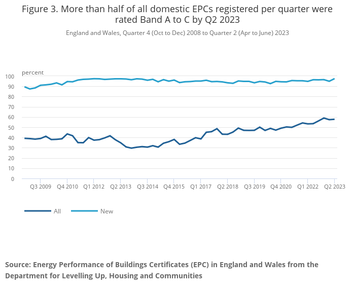 During Quarter 2 (Apr to June) of 2023, over half (58%) of all EPCs lodged in England and Wales were rated band C or above, according to the latest Department for Levelling Up, Housing and Communities (DLUHC) Domestic EPC dataset. This is an increase of 19 percentage points since Quarter 4 (Oct to Dec) of 2008, when EPCs were first made mandatory for all domestic properties. For new dwellings, 98% were rated band A to C during Quarter 2, 2023, as shown in Figure 3.