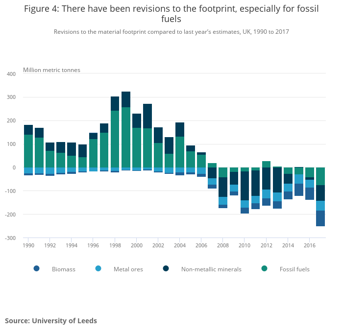 Revisions to the material footprint compared to last year’s estimates, UK, 1990 to 2017