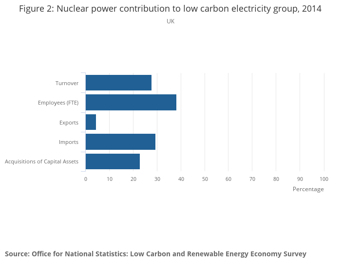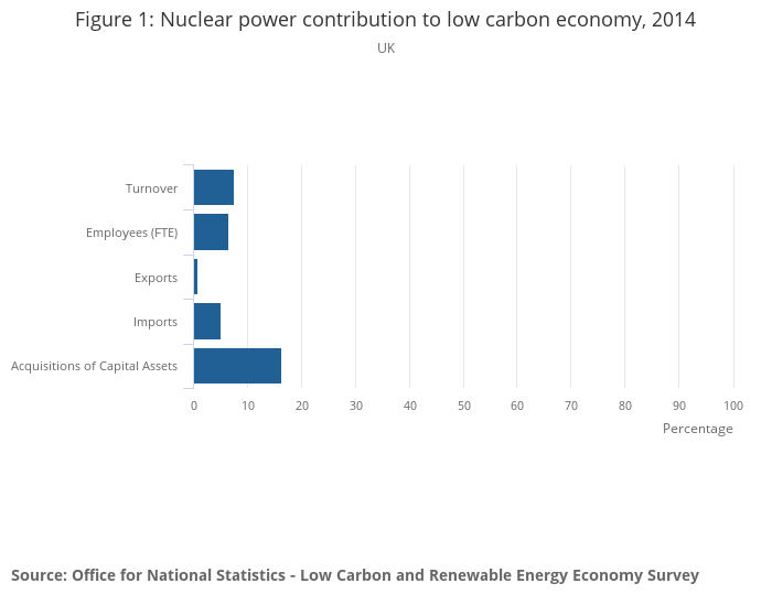 The Office for National Statistics (ONS) launched a new survey in 2015, collecting data on the low carbon and renewable energy (LCRE) economy. The first high-level results were published in December 2015. In order to produce timely estimates and respond to demand for greater detail, this is the second in a series of sector-specific articles prior to final results scheduled to publish in May 2016. The first article, published in March 2016, focussed on the UK solar photovoltaic sector and can be found here: UK environmental accounts: UK solar photovoltaic sector 2014. In this article, comparisons are made between the nuclear power sector and solar photovoltaic sector. Comparisons to additional sectors will be made as more data are published.