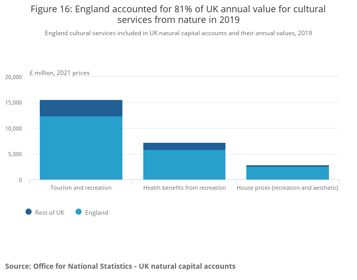 Over half (57%) of the annual value in England in 2020 was derived from cultural services, predominantly recreation and tourism (£12.4 billion) and health benefits (£5.5 billion) associated with this.