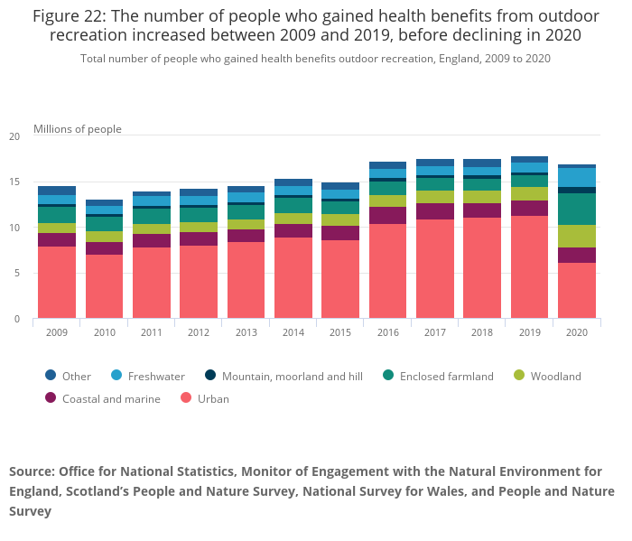 Download this chart Figure 22: The number of people who gained health benefits from outdoor recreation increased between 2009 and 2019, before declining in 2020