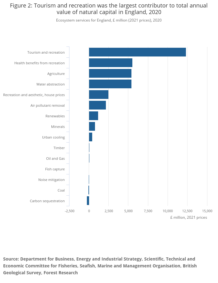 Figure 2: Tourism and recreation was the largest contributor to total annual value of natural capital in England, 2020