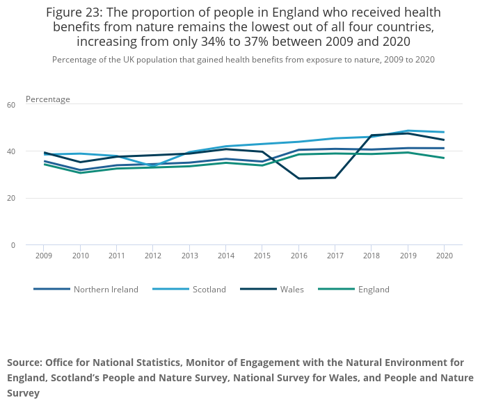 Figure 23: The proportion of people in England who received health benefits from nature remains the lowest out of all four countries, increasing from only 34% to 37% between 2009 and 2020