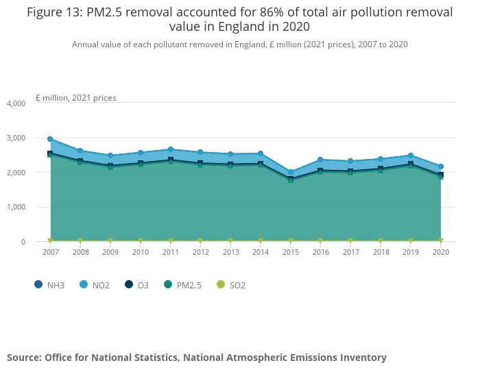 Figure 13: PM2.5 removal accounted for 86% of total air pollution removal value in England in 2020