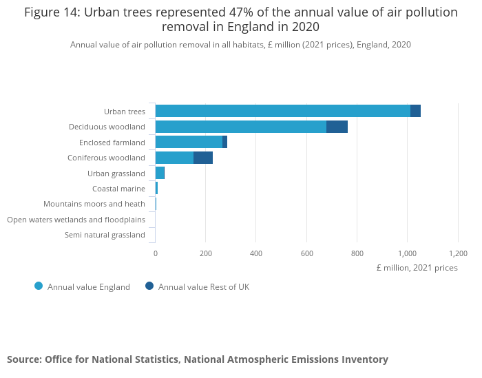 Download this chart Figure 14: Urban trees represented 47% of the annual value of air pollution removal in England in 2020